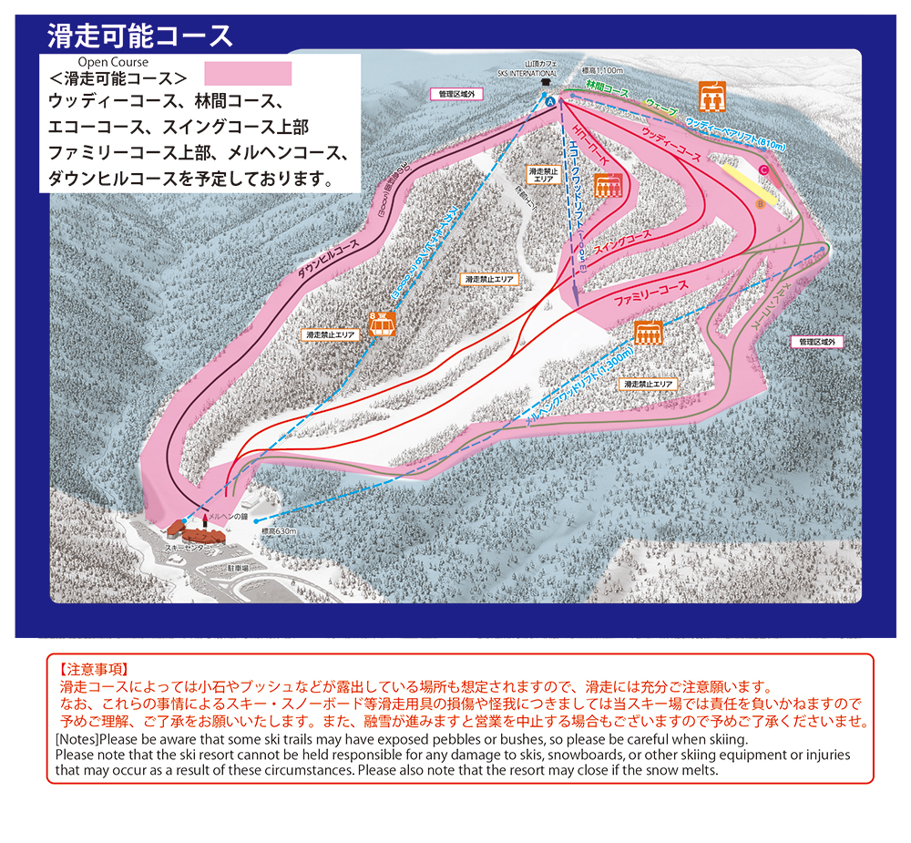 [Notes]Please be aware that some ski trails may have exposed pebbles or bushes, so please be careful when skiing.