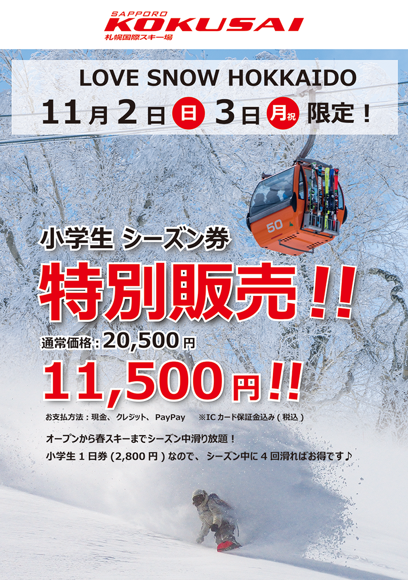 11月2日、3日LOVESNOW HOKKAIDOにて小学生シーズン券特別販売!!