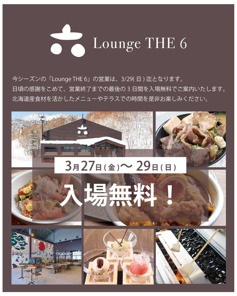 今シーズンの「Lounge THE 6」の営業は、3/29(日)迄となります。 日頃の感謝をこめて、営業終了までの最後の3日間を入場無料でご案内いたします。 北海道産食材を活かしたメニューやテラスでの時間を是非お楽しみください。
